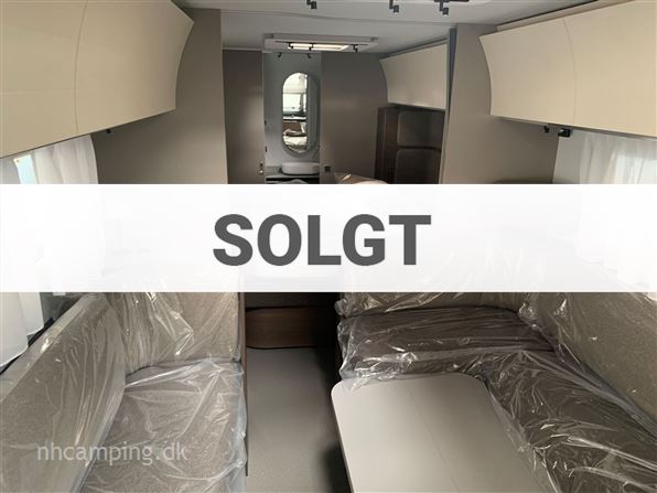 Luksusvogn med fritstående dobbeltseng. Stort køkken i fronten med panorama vindue. Stor rundsiddegruppe i midten og siddegruppe overfor, bord kan udvides. Stort toiletrum på tværs i bagenden af campingvognen. Vognen er med alde centralvarme og vandbåren gulvvarme.