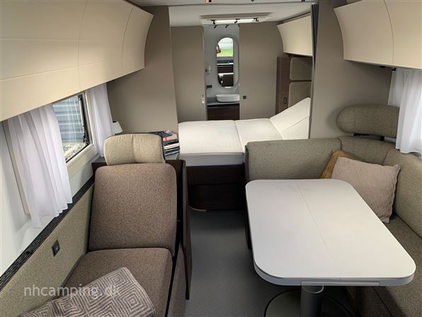 Luksusvogn med lækkert vinkelkøkken i hele forenden med panoramavindue, stor siddegruppe i midten med ekstra EL CHAISELONG over for, queensbed på tværs samt stort toiletrum i hele bagenden. En eksklusiv helårsvogn med høj komfort og masser af plads.