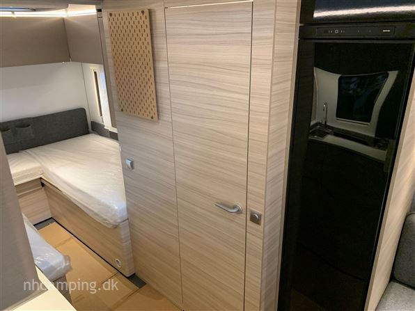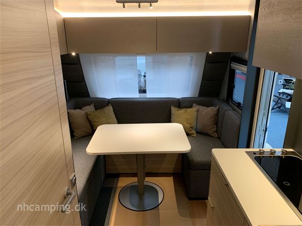 Denne vogn er med rundsiddegruppe i front, pænt køkken med stort køleskab og toilet med bruser i midten og 2 enkeltsenge med lameludtræk i bagenden. Der er masser af lækker LED belysning, Gulvvarme, USB stik.