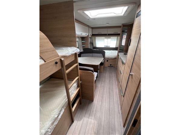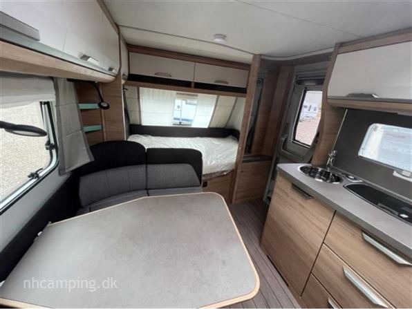 Super lækker Knaus til børnefamilien. Indrettet med køjer, dobbelt seng i fronten, siddegruppe i midten og køkken, toilet og skabsplads, og med lækker lys interiør og god rummelighed.