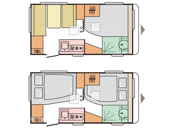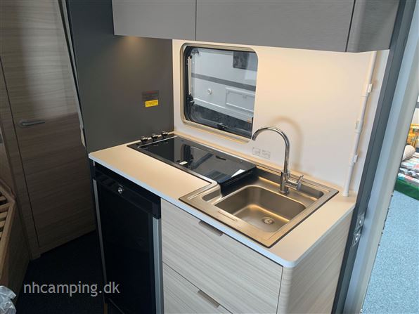 En let rejse campingvogn med fransk seng i front og en sidesiddegruppe i venstre side bag.Den perfekte køre vogn med en totalvægt på kun 1300 kg.