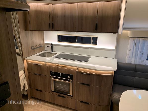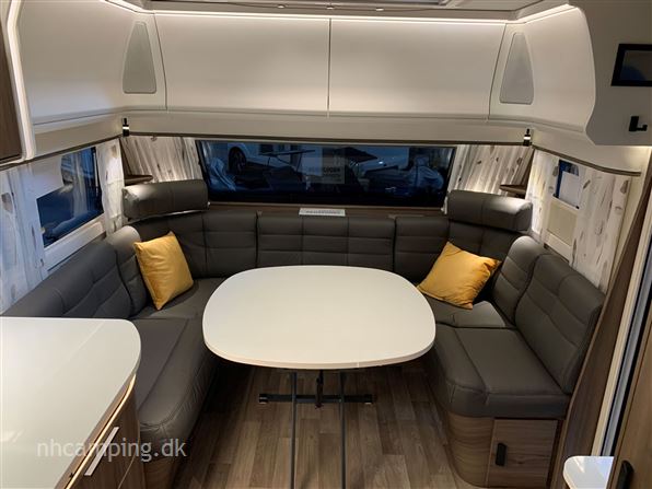 Dobbeltseng, rundsiddegruppe i mørkegråt skind, ALDE centralvarme, vandbåren gulvvarme, stort kompressor køle/ frys, Designpakke (vindue i dør, 15" alufælge, trækstangsafdækning, HEKI II tagluge) ATC, Glatte alu-sider, gasbageovn, radio m/ Bluetooth, el-indgangstrin, Komfortpakke (nakkepuder, serviceklap, håndklædetørrer, elektrisk seng) tv-antenne, batteripakke, wifi-antenne, direkte afløb.