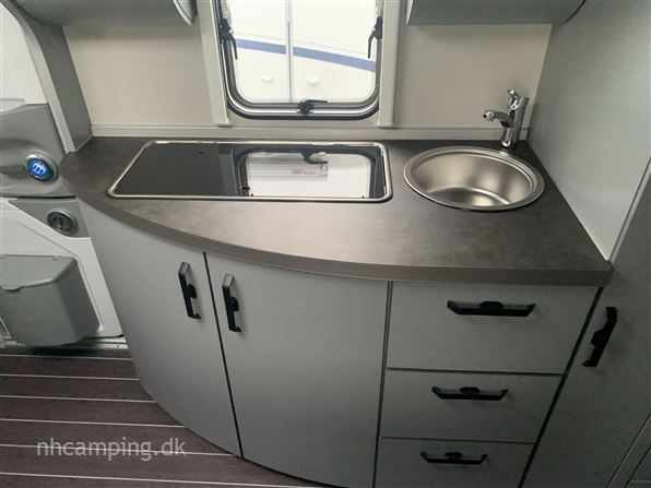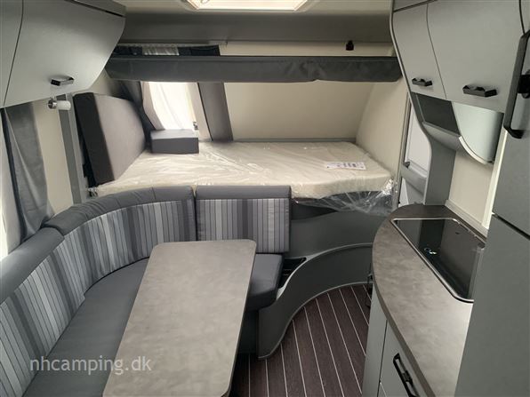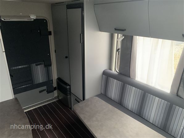 Knaus Sport & Fun 480 QL dobbeltseng på tværs i front med stort garagerum nedenunder, siddegruppe og køkken i midt, toiletrum i bagende. Perfekt rejsevogn med ekstra indgangsdør i bagenden. Udstyret: glasfibertag, 17" alufælge